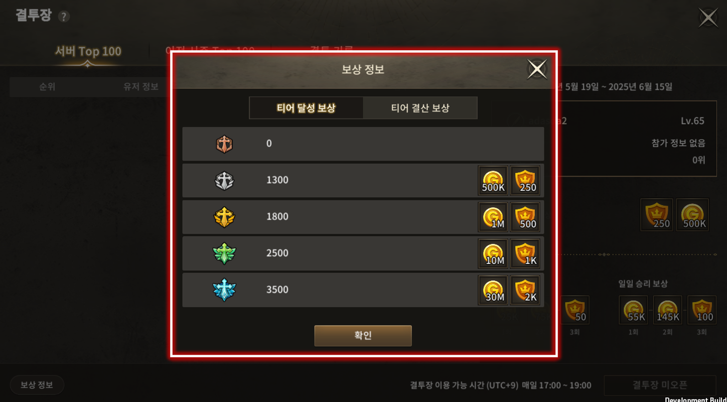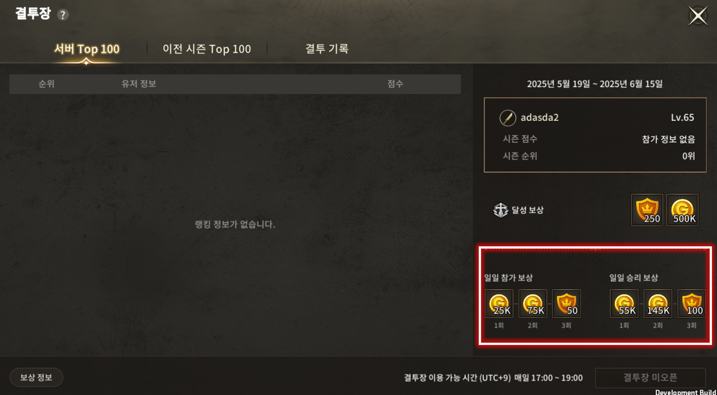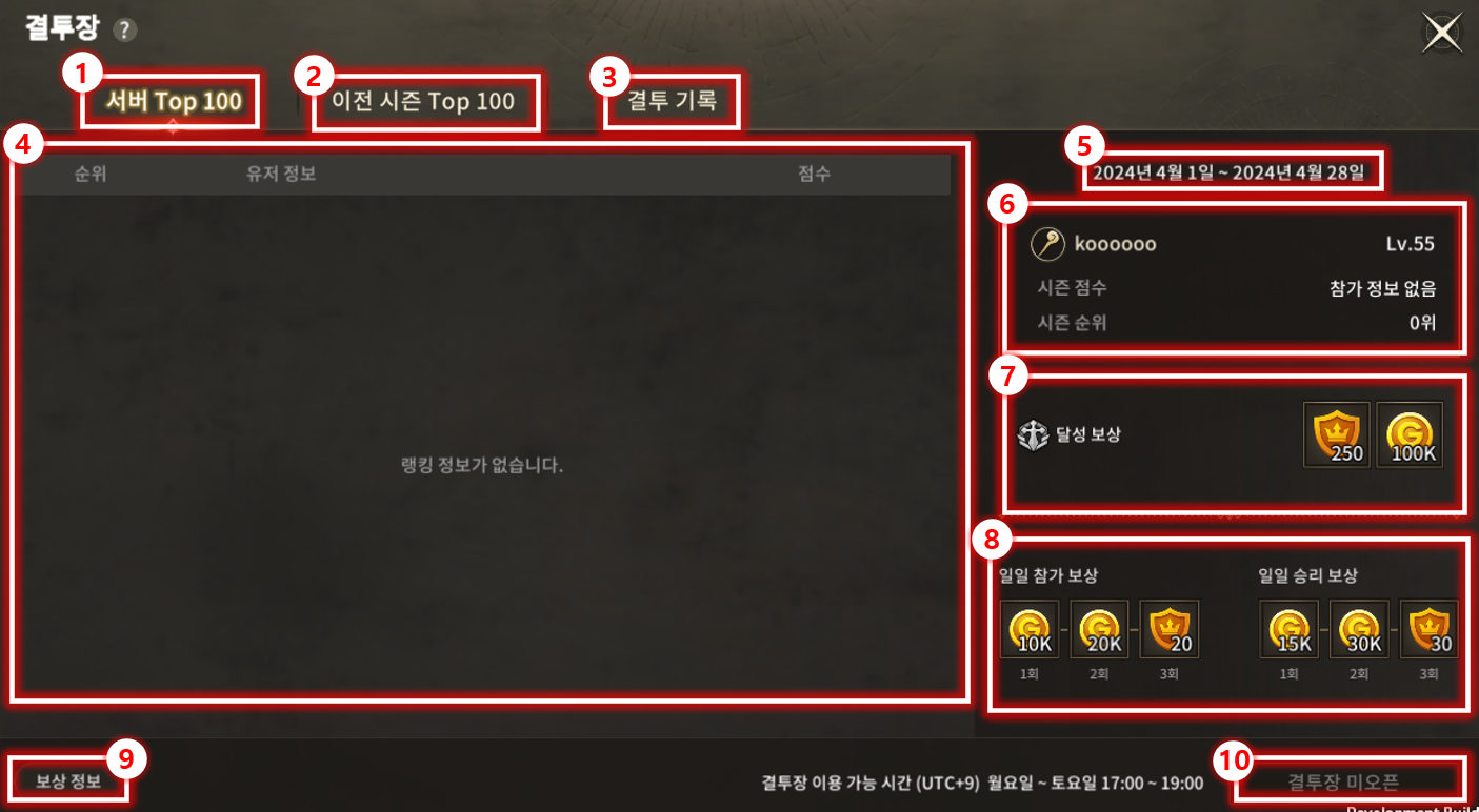 | 8 | 참가 보상 및 승리 보상 | 유저가 매일 결투장 참가 시 획득할 수 있는 일일 & 승리 보상을 보여줍니다. |