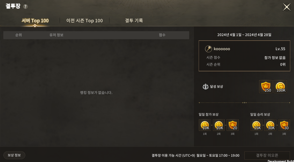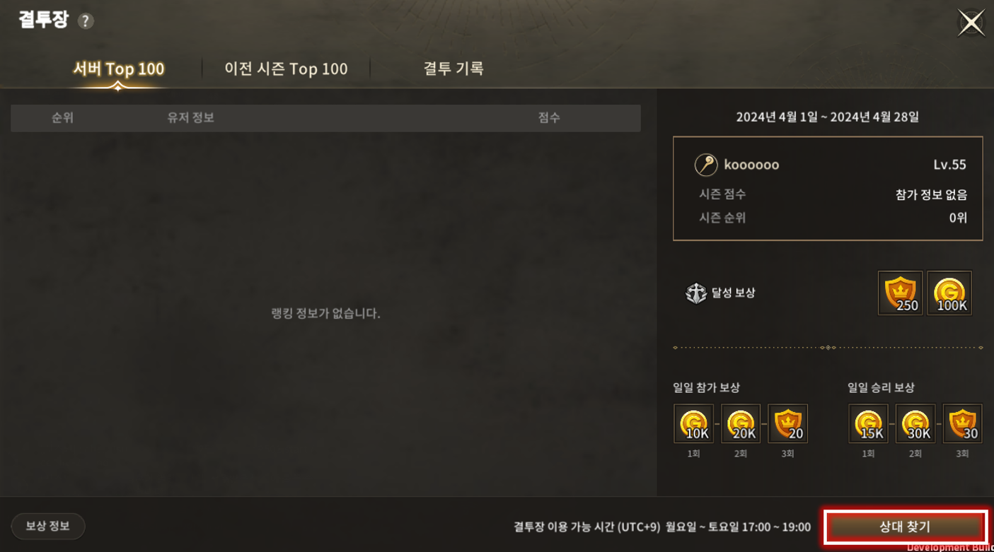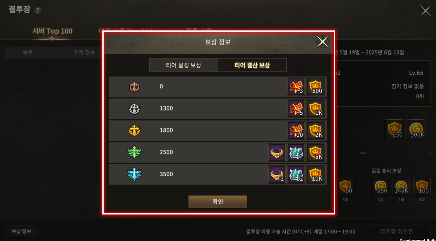 | 8 | 참가 보상 및 승리 보상 | 유저가 매일 결투장 참가 시 획득할 수 있는 일일 & 승리 보상을 보여줍니다. |