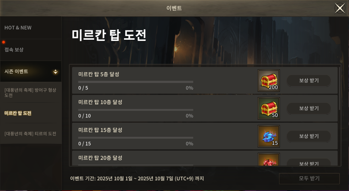 미르칸 탑 30층 달성 | ![]() 영웅 소환 선택 상자 (이벤트) |