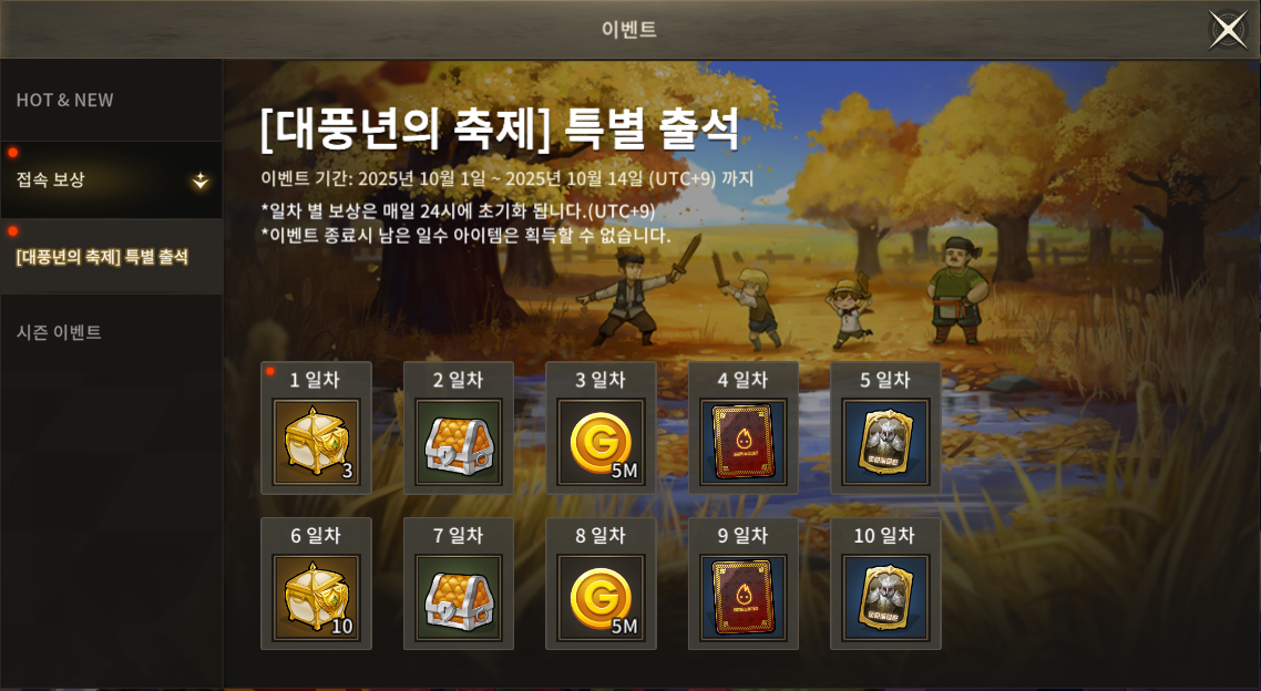 - 게임에 접속하시면 이벤트 페이지에서 [대풍년의 축제] 특별 출석 이벤트를 확인하실 수 있습니다.