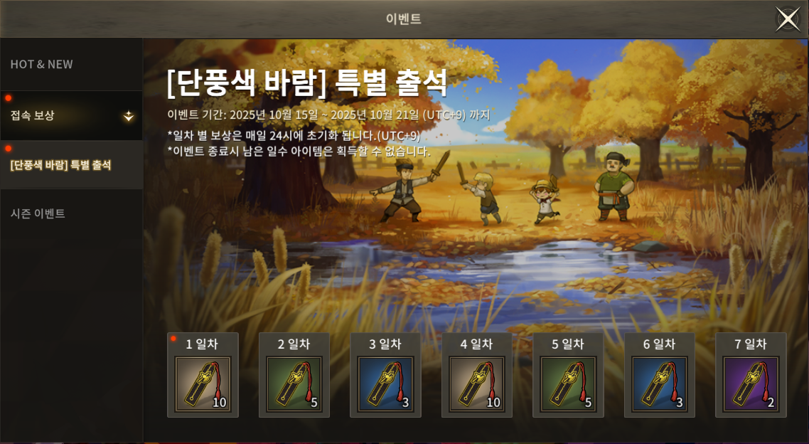 - 게임에 접속하시면 이벤트 페이지에서 [단풍색 바람] 특별 출석 이벤트를 확인하실 수 있습니다.