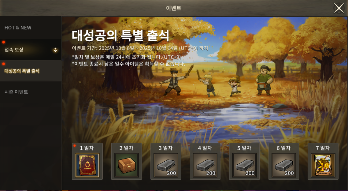 - 게임에 접속하시면 이벤트 페이지에서 대성공의 특별 출석 이벤트를 확인하실 수 있습니다.