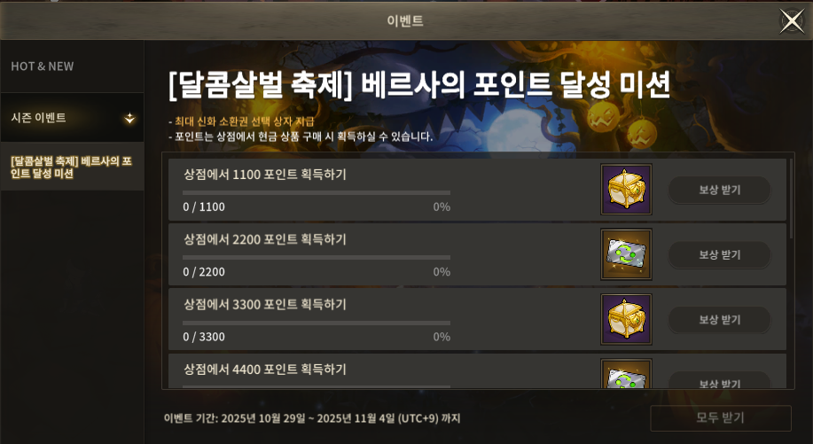| 상점에서 상품 구매 - 10월 31일 | 달빛 축제 상자 30개 |