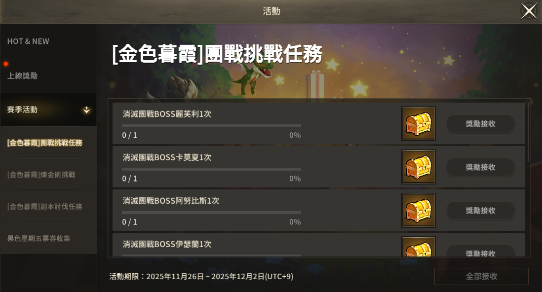 ☆ 活動內容- 在活動期間完成指定任務,即可獲得各 BOSS 的金色寶箱獎勵!
