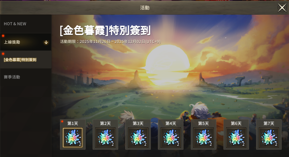 - 只要登入遊戲,即可在活動頁面查看 [金色暮霞]特別簽到 活動。