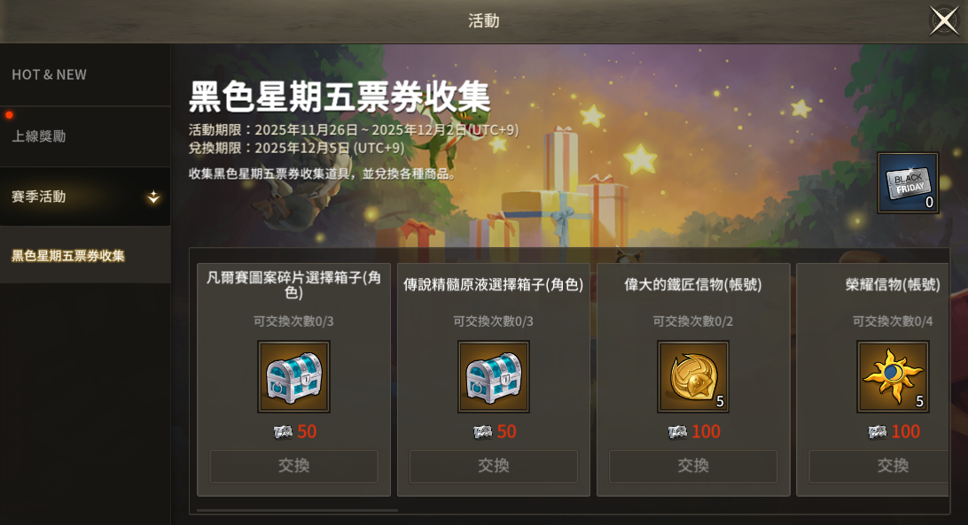 - 登入遊戲後,可在活動頁面查看 黑色星期五票券收集活動。