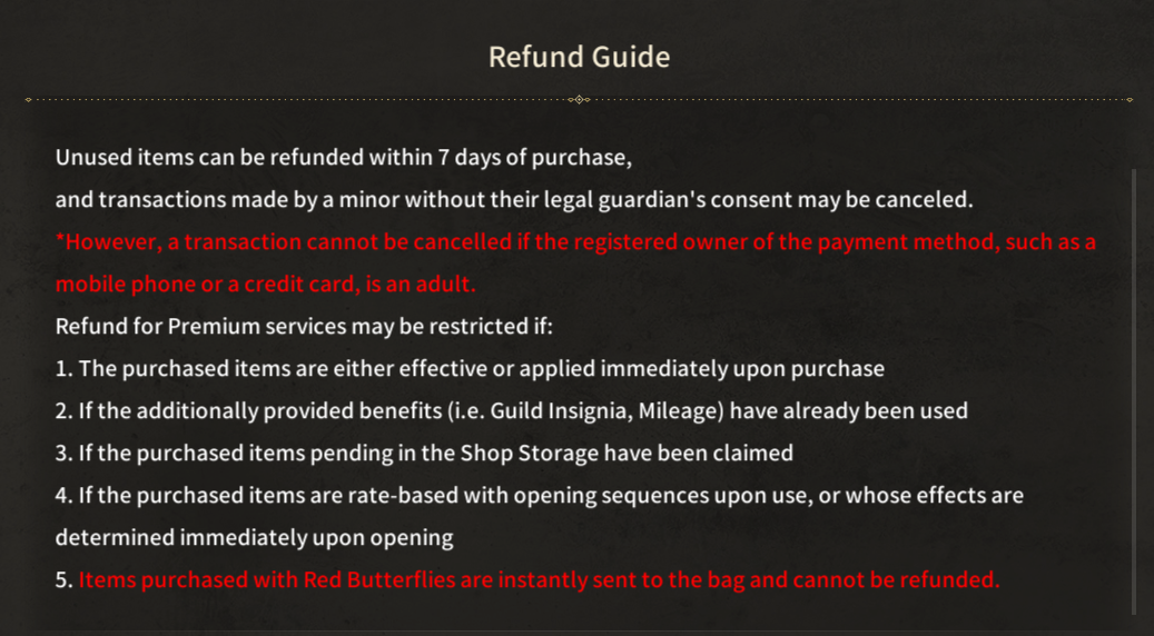 ※ Details can be checked at the in-game Shop > Purchase Item > Details > Refund Guide.