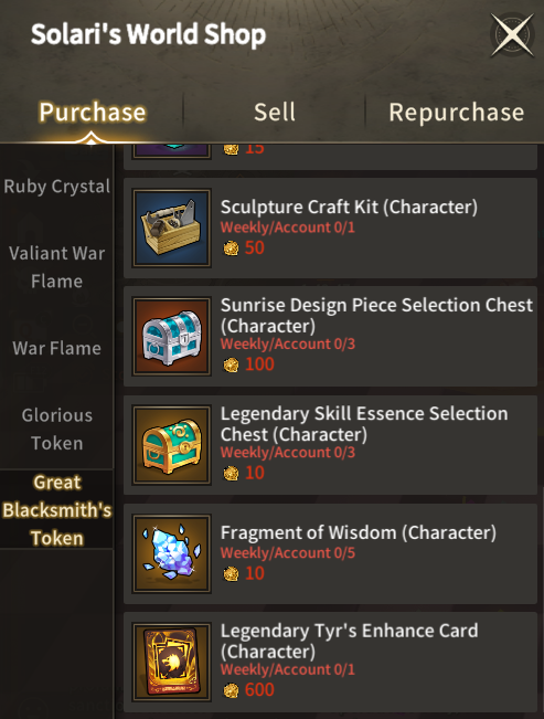 | Great Blacksmith's Token | Sunrise Design Piece Selection Chest (Character) | 3 Per Week | 100 |