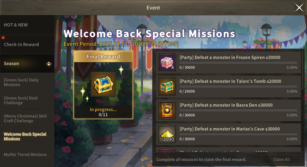 - Welcome Back Special Missions can be checked at the Event Page on login.
