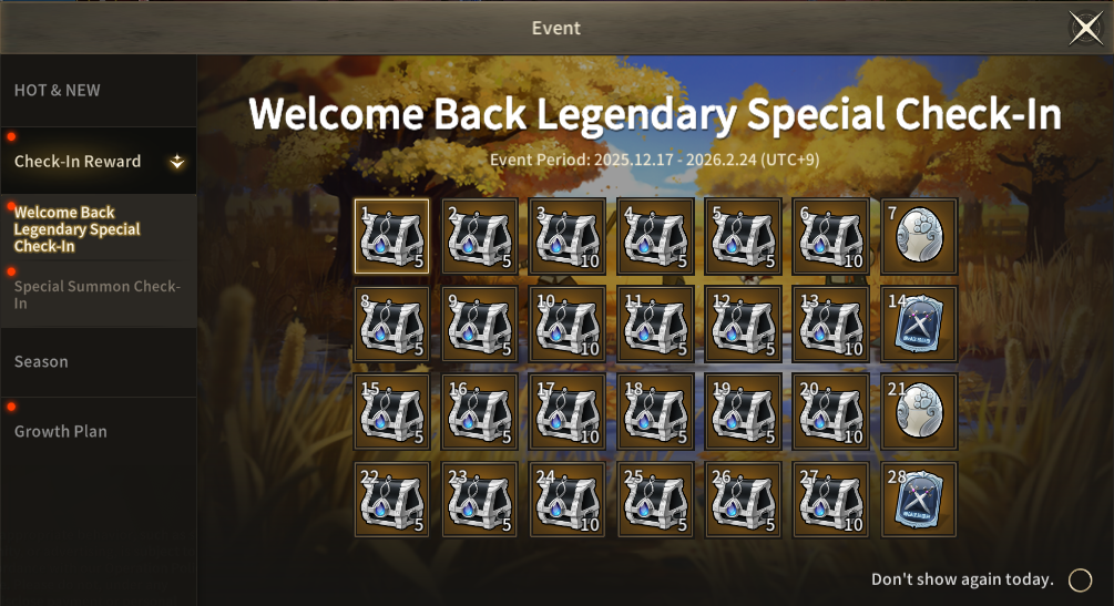 - Rewards can be acquired for 28 days through [Welcome Back Legendary Special Check-In] at Event > Login Reward.