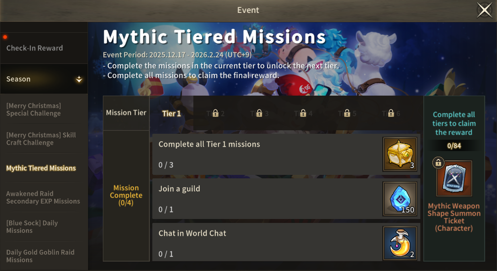 - The Tiered Missions towards the Mythic Weapon Shape Summon Ticket will begin at the Event Page!