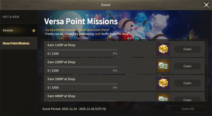 ※ Details can be checked at the [Event > Versa Point Missions].